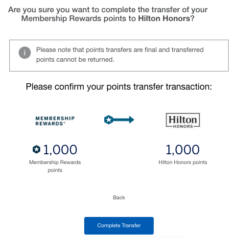When you go to initiate a transfer, on the Amex transfer screen you’ll only see the standard 1:1 ratio displayed. However, as long as you transfer points during the promotion, the additional 50% bonus should post separately once the points hit your Hilton Honors account, so don’t be alarmed if you transfer points and don’t see the bonus right away.