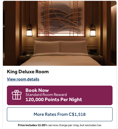 On some nights, the cash price for the same room might equal $1,500 (CAD) or more, though it could also be less.