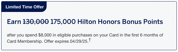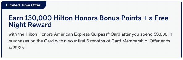 As part of the limited-time offer, you can earn 130,000 Hilton Honors points and a Free Night Reward upon spending $3,000 in the first six months. Offer ends April 29, 2025.