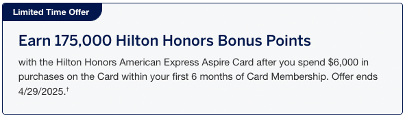 - Hilton Honors American Express Aspire Card: 175,000 Points!