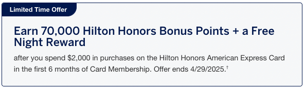 As part of the limited-time offer, you can earn 70,000 Hilton Honors points and a Free Night Reward upon spending $2,000 (all figures in USD) in the first six months. Offer ends April 29, 2025.