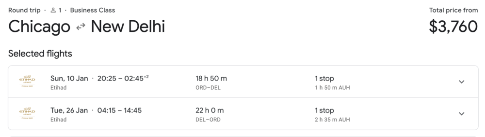 Here’s on example of Chicago–New Delhi round-trip for $3,760 (CAD):