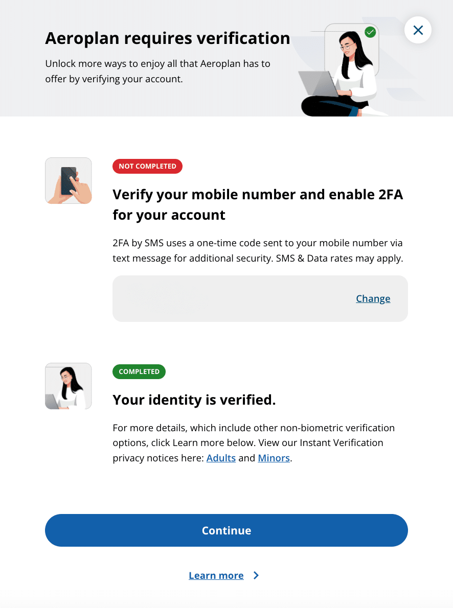 Verifying your Aeroplan account is a two-step procedure.