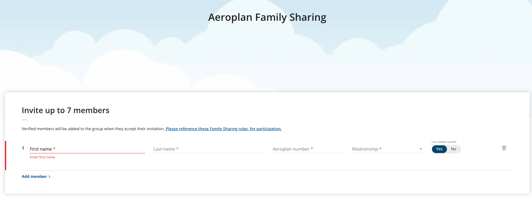 Here, you’ll need to add their first name, last name, Aeroplan number, and their relationship to you. You can also specify whether or not they can redeem points.