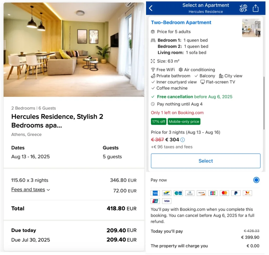 If you’re purely looking for the lowest price, this probably isn’t your best bet. In fact, when I checked the same property I stayed at—for the same dates—Booking.com showed a price of €399.90, while Marriott Homes & Villas listed it at €418.80.