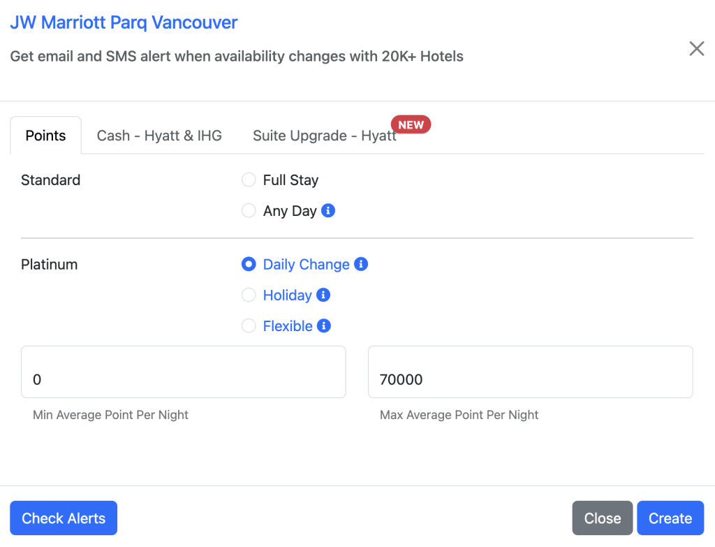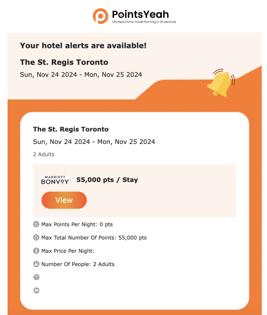 Similarly, if you hold a 35K Free Night Award (FNA) from Marriott Bonvoy and want to use it without topping up additional points, you can set an alert for 35,000 points in your destination city and get notified when any eligible hotel becomes available.