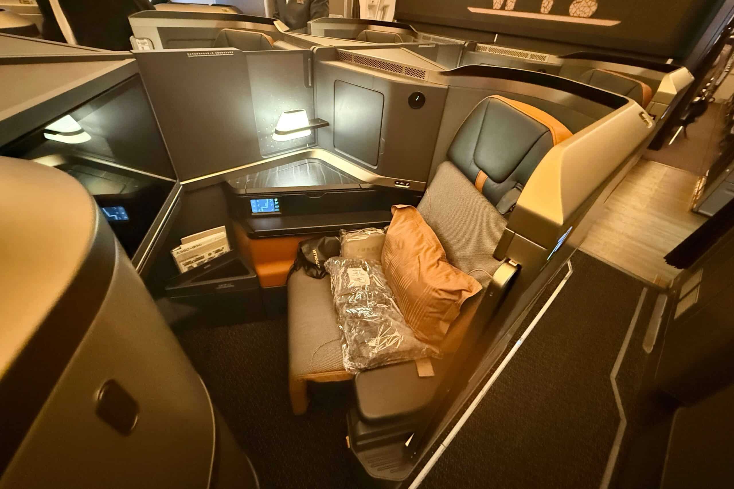 I chose the kids’ premium economy seats as close to the business class cabin as possible, and our business class seats as close to premium economy as possible. I seated the youngest on the aisle, as I knew she’d probably have to go to the bathroom the most and my eldest next to an open seat so he’d be next to another passenger potentially.