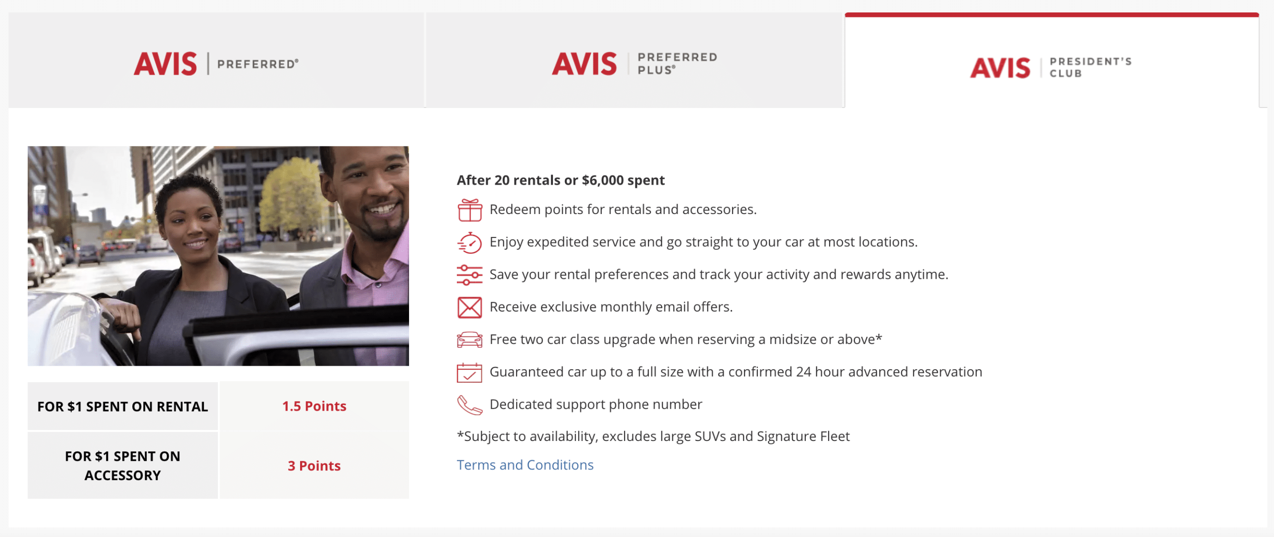 - Complimentary Avis® President’s Club membership, providing free car-class upgrades and priority service.