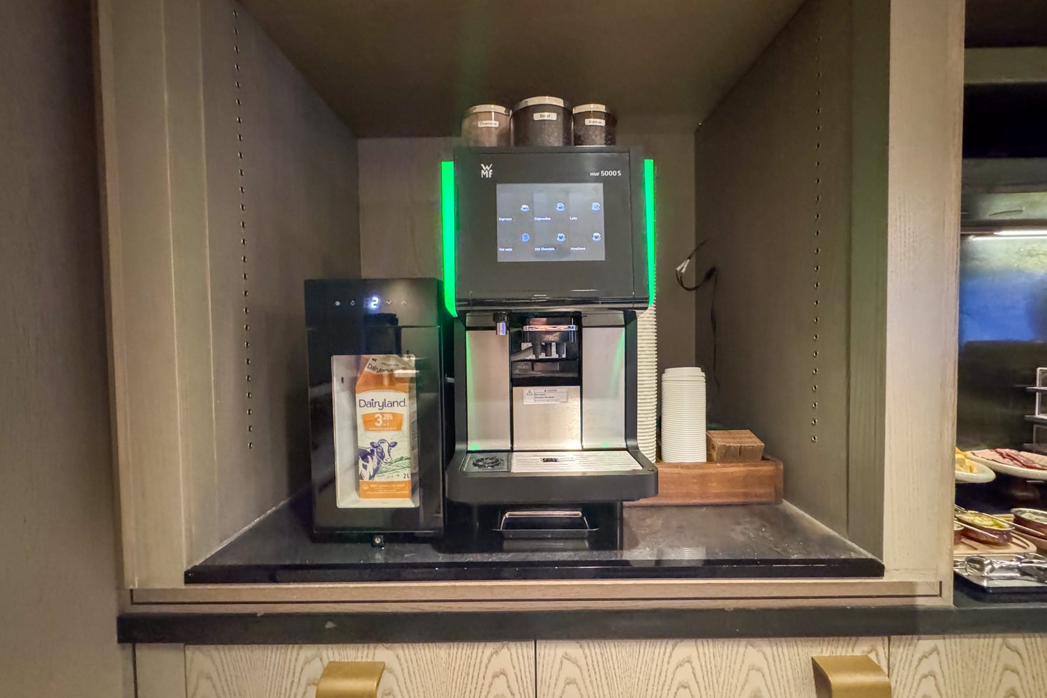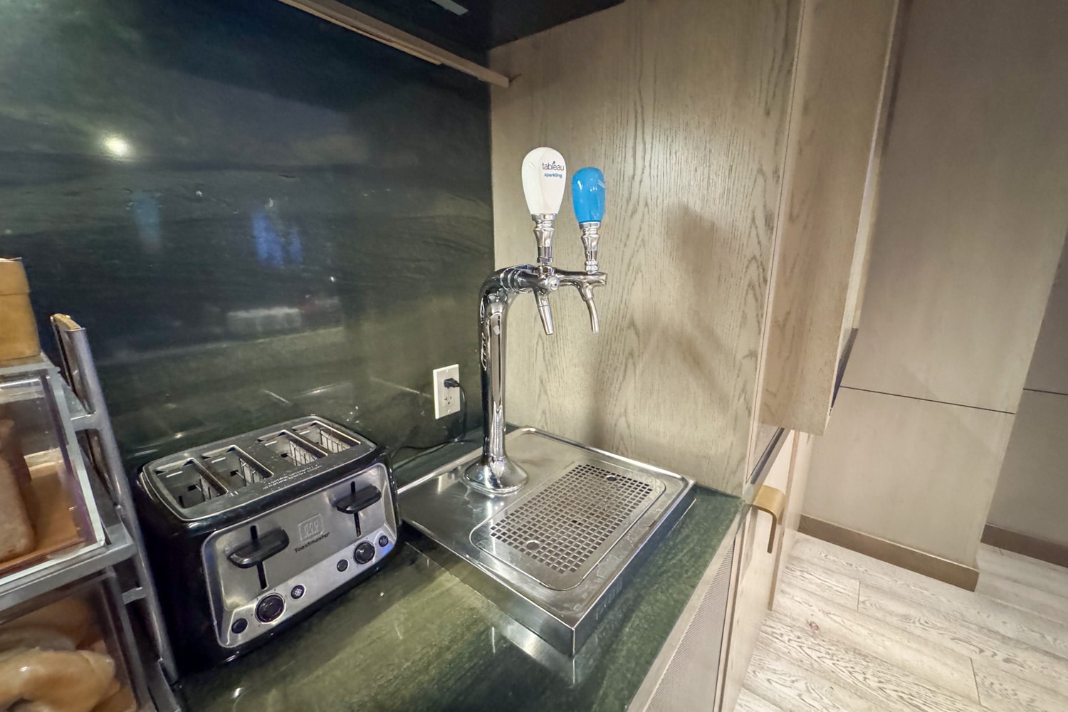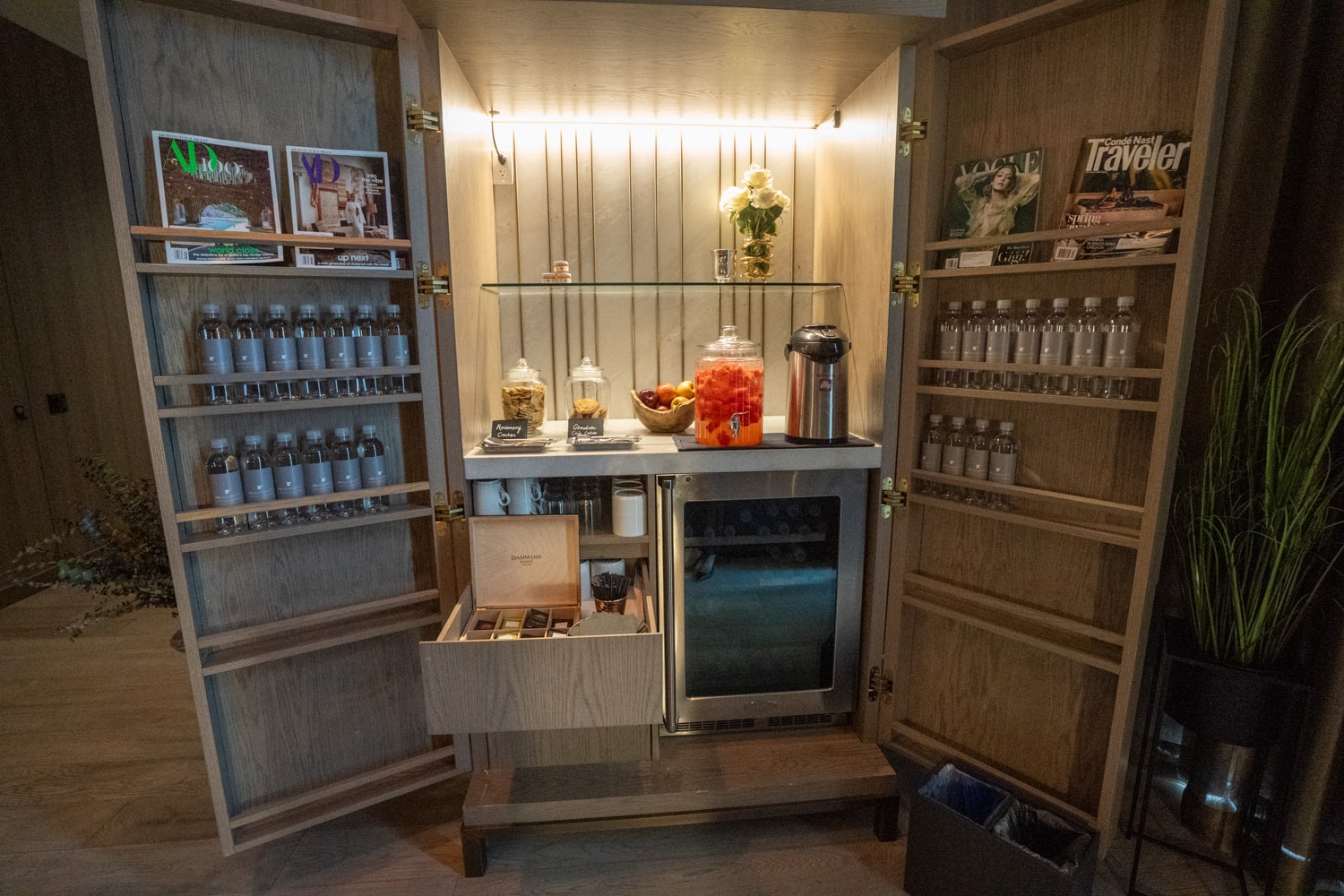 There are pretzels, chips, popcorn, nuts, and cookies available throughout the day, as well as a coffee machine, drip coffee, a nice selection of tea, non-alcoholic drinks, and still/sparkling water on tap.