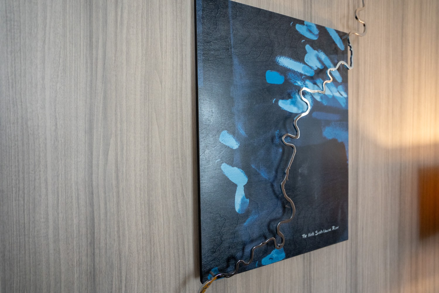 There is definitely an Albertan motif in the decorations in the room. Above the headboard, there are portraits of oil derricks pumping in a field, and in the living room is a piece depicting the North Saskatchewan River which runs through Edmonton’s river valley. Plus, the alarm clocks look like hockey pucks.