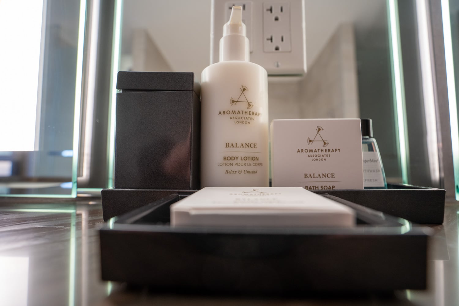 In the bathroom, you’ll find amenities from Aromatherapy Associates and comfy bath robes, and in the living room you’ll find an Illy coffee maker and a unique ice menu.