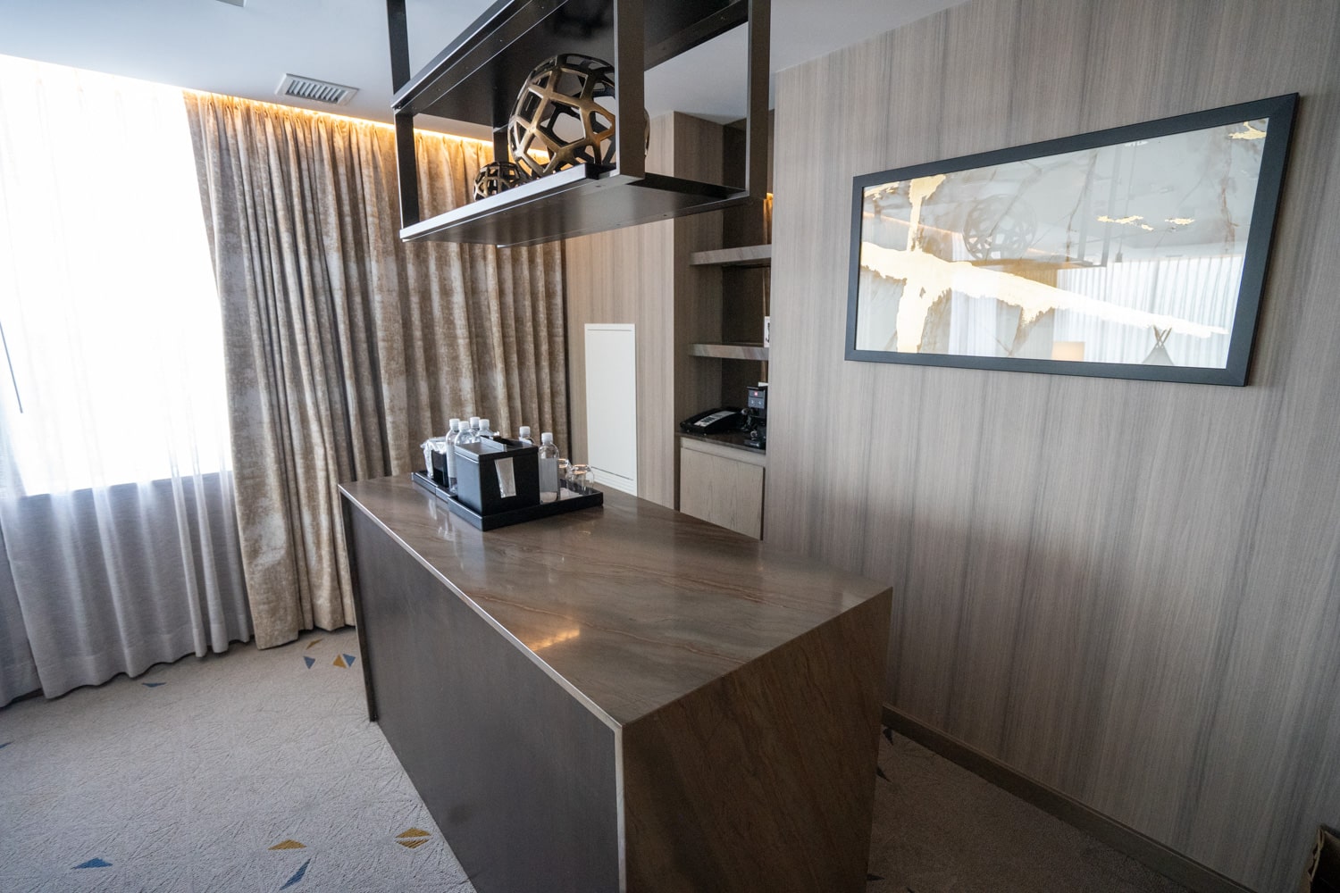 The suite is spacious, and came with a huge bathroom with a soaker tub and a separate shower, a large living area with a separate bar, and a cozy king bed in the bedroom.