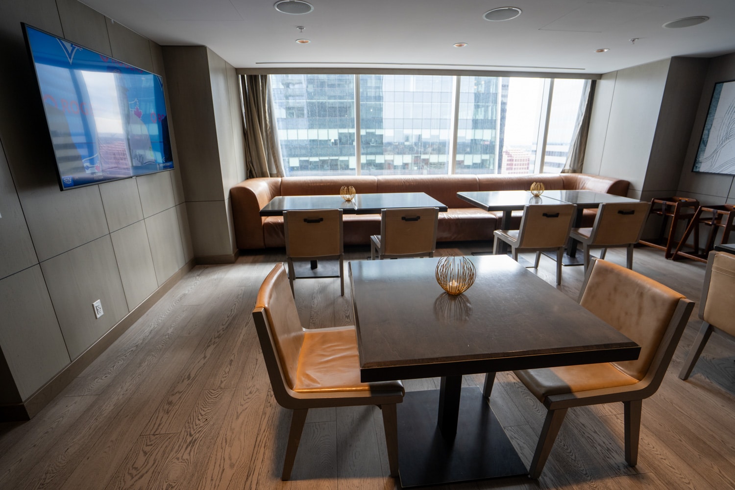 The lounge is situated in the corner of the hotel, with views of the downtown core.