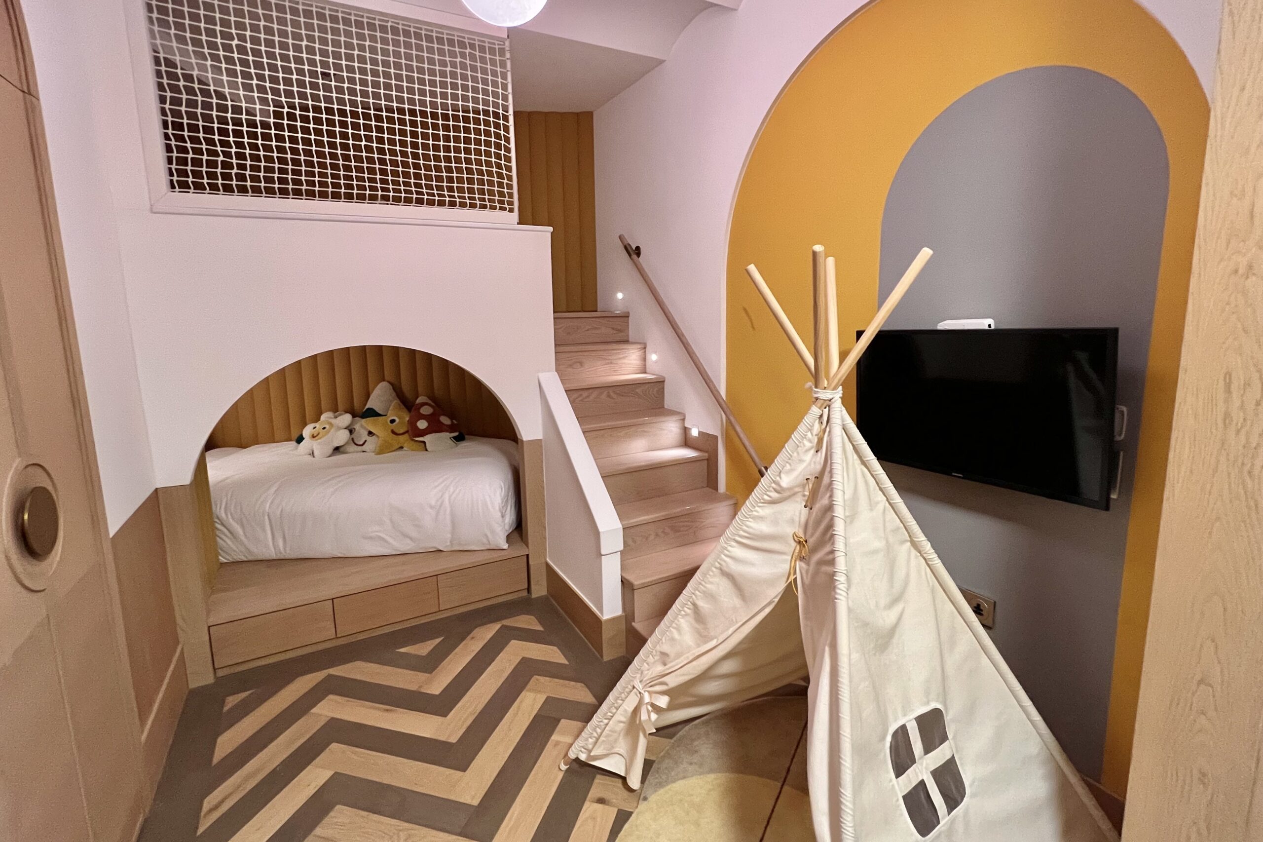 As we made our way to our suite, the ambiance immediately evoked the feeling of a traditional Korean hanok, with hallways featuring white patch-style walls paired with light wood paneling. Soft golden-toned accents–paying tribute to Jeju’s iconic canola blossoms–brought a gentle warmth to the space, while decorative replicas of Jeju’s flying fish adorning the walls reminded us of the island’s maritime heritage.