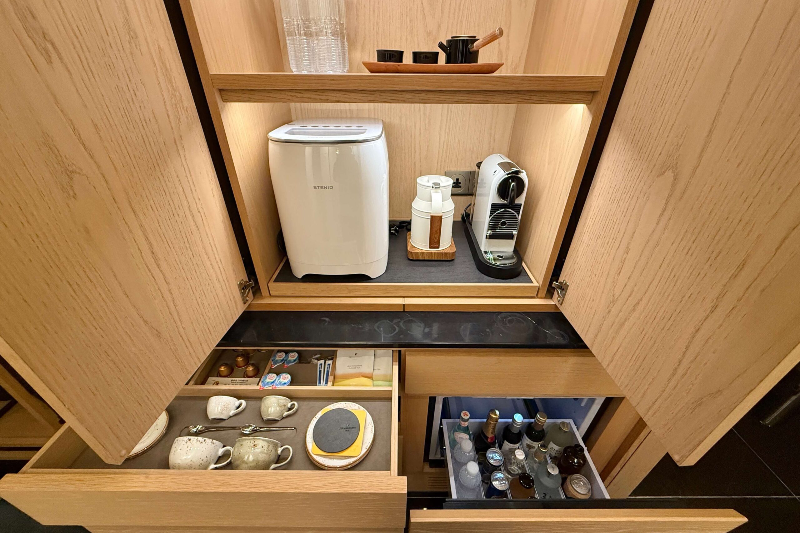 A wall partition separated the living area from the beverage station that featured an in-room ice maker, electric kettle, Nespresso machine, and stocked mini fridge offering a selection of drinks for purchase.