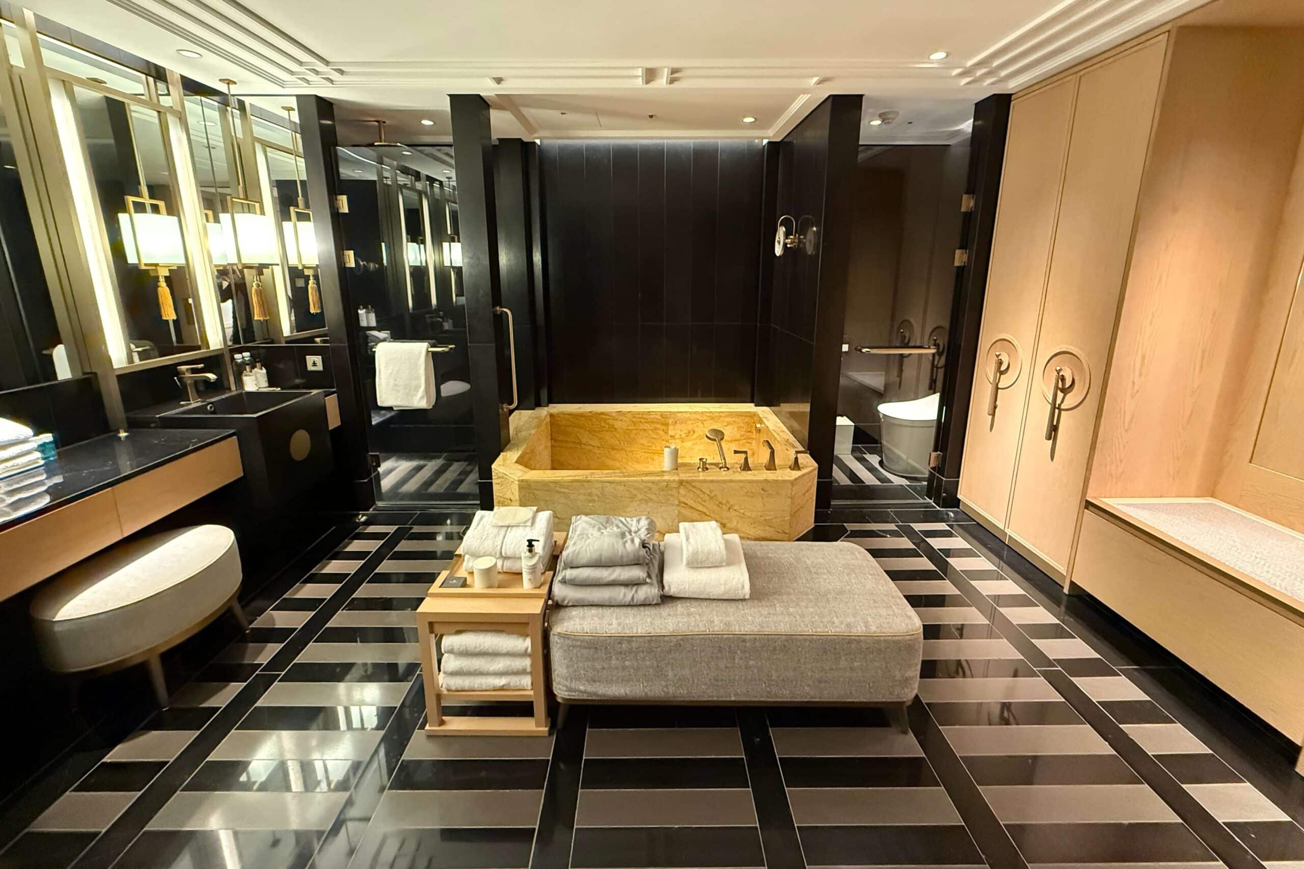 The spacious marble bathroom was a true highlight, designed to evoke a spa-like retreat. At its center was an oversized, onsen-inspired soaking tub, seamlessly accessible from the adjacent walk-in rainfall shower. A nice touch was that the water warmed up almost instantly, which was definitely a win in my books.