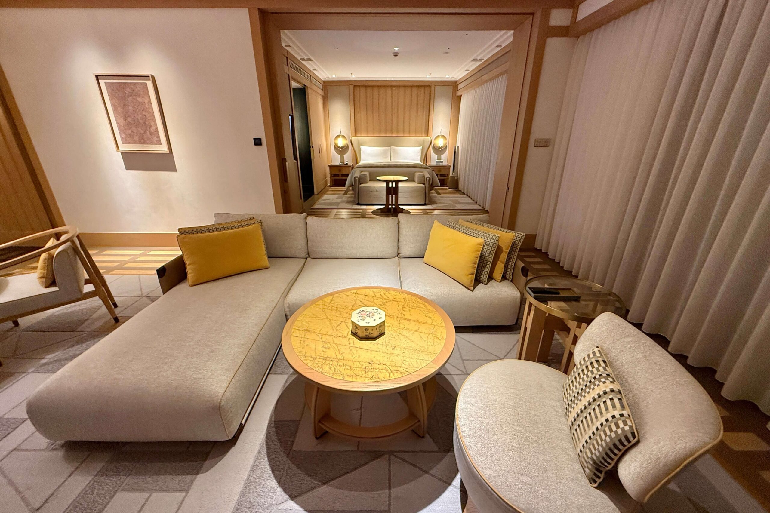 Inside, the suite boasted an elegant open-concept layout with distinct living and sleeping areas separated by a sliding wall, styled in a refined palette of warm neutrals. Subtle Jeju-inspired design elements lent a sophisticated sense of place, blending luxury with cultural homage.