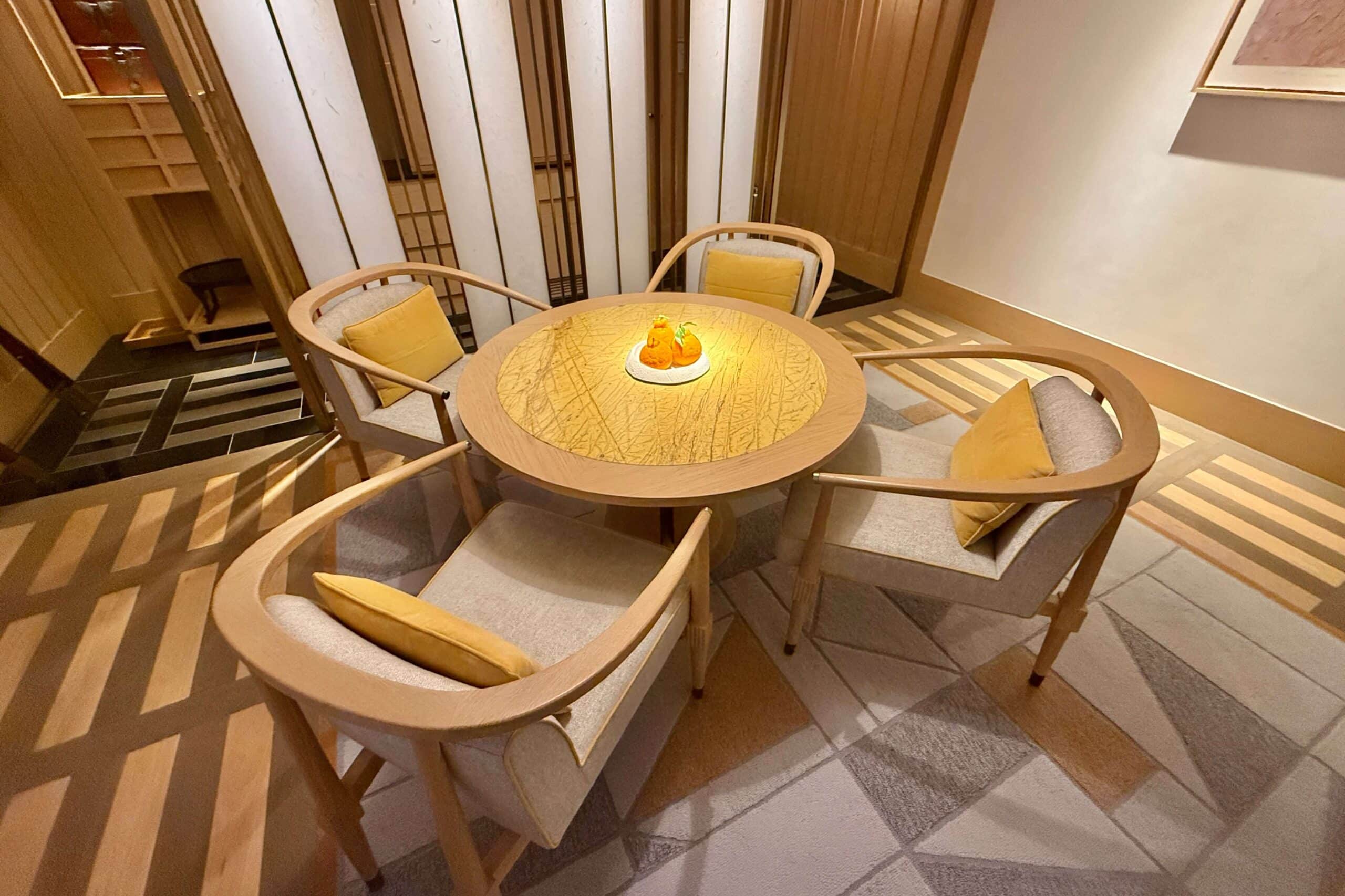 A cozy dinette, perfect for enjoying in-suite meals, was thoughtfully set with a plate of fresh Jeju oranges for us to sample.