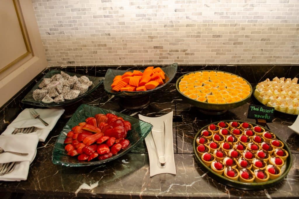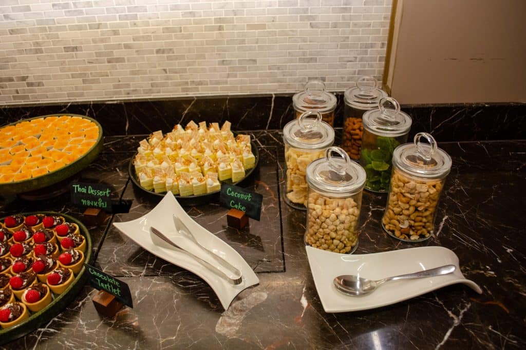 We popped in for a quick snack and a drink on the evening of our stay. The lounge had a fairly impressive buffet, which included sushi, gyoza, tom kha gai soup, charcuterie, pastries, and light snacks.