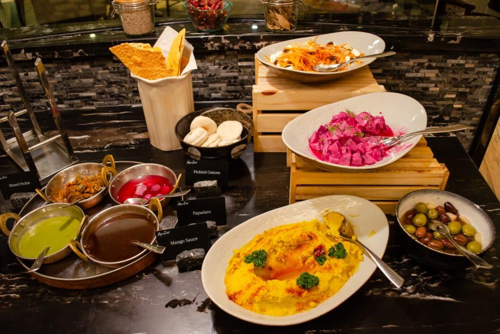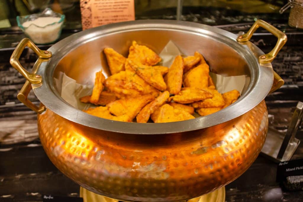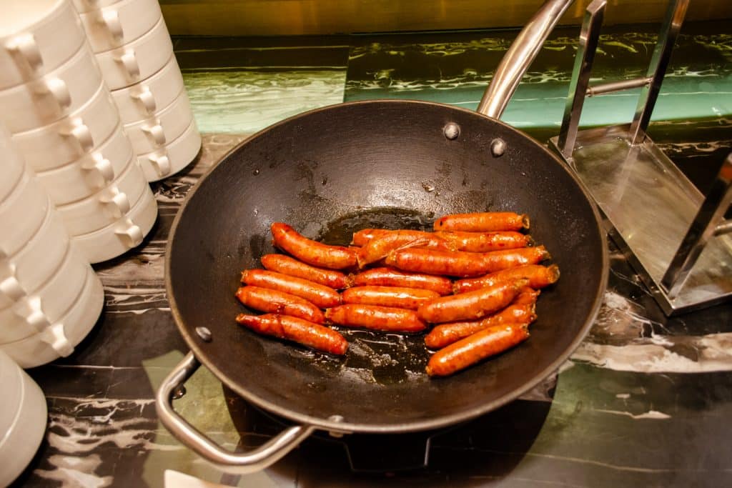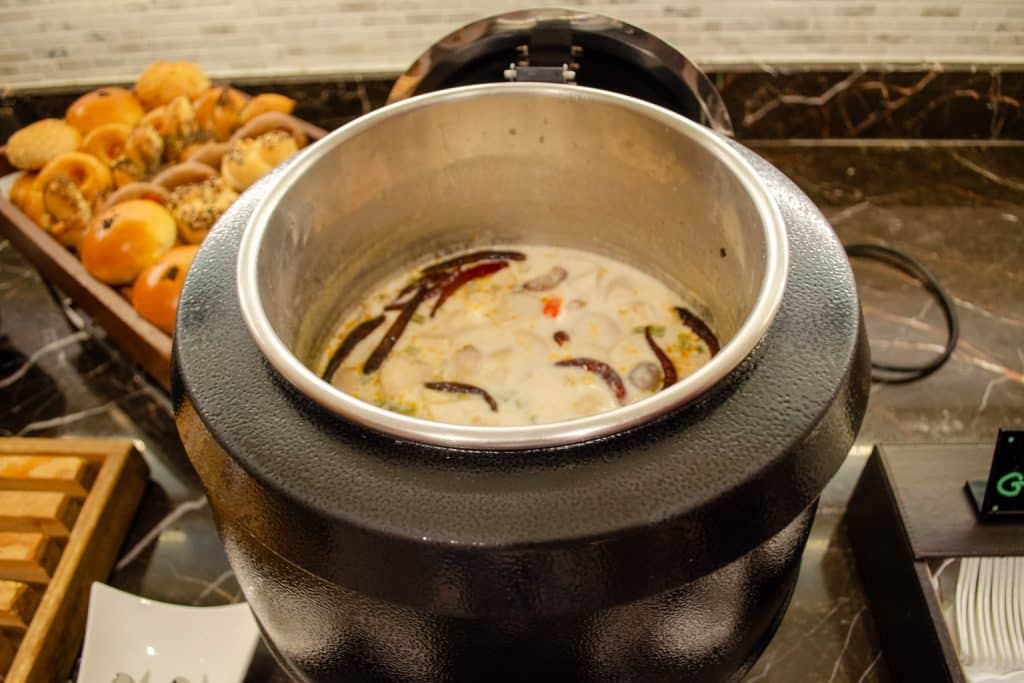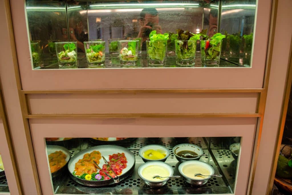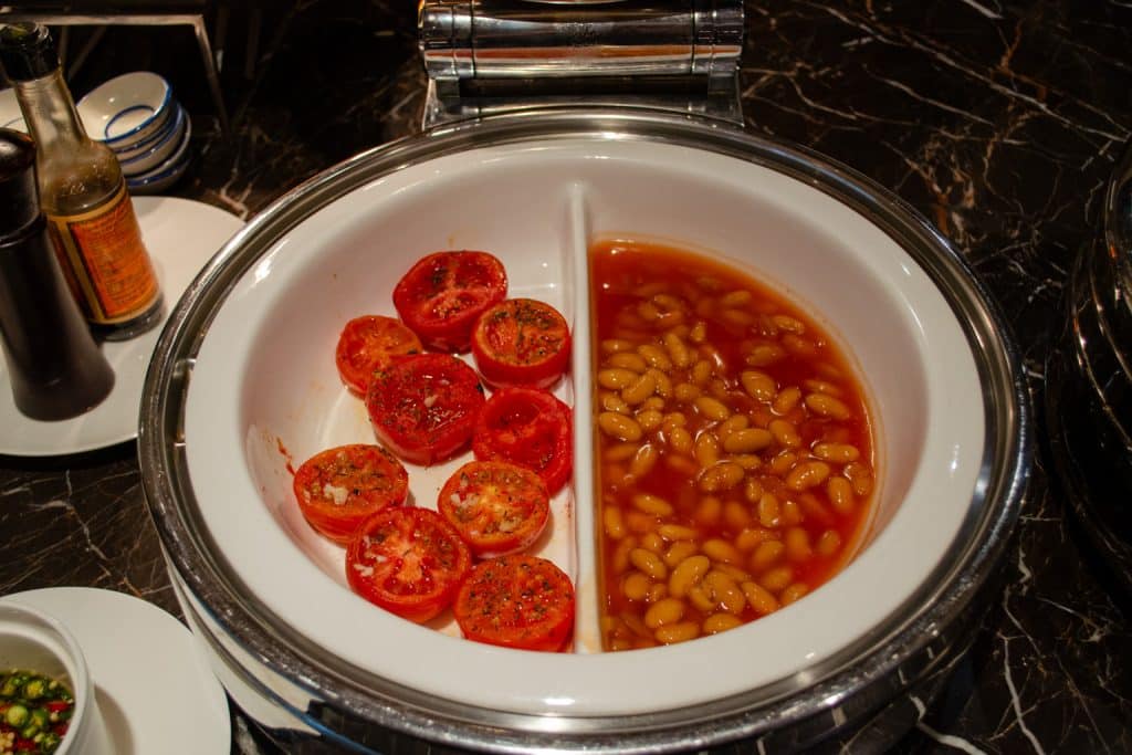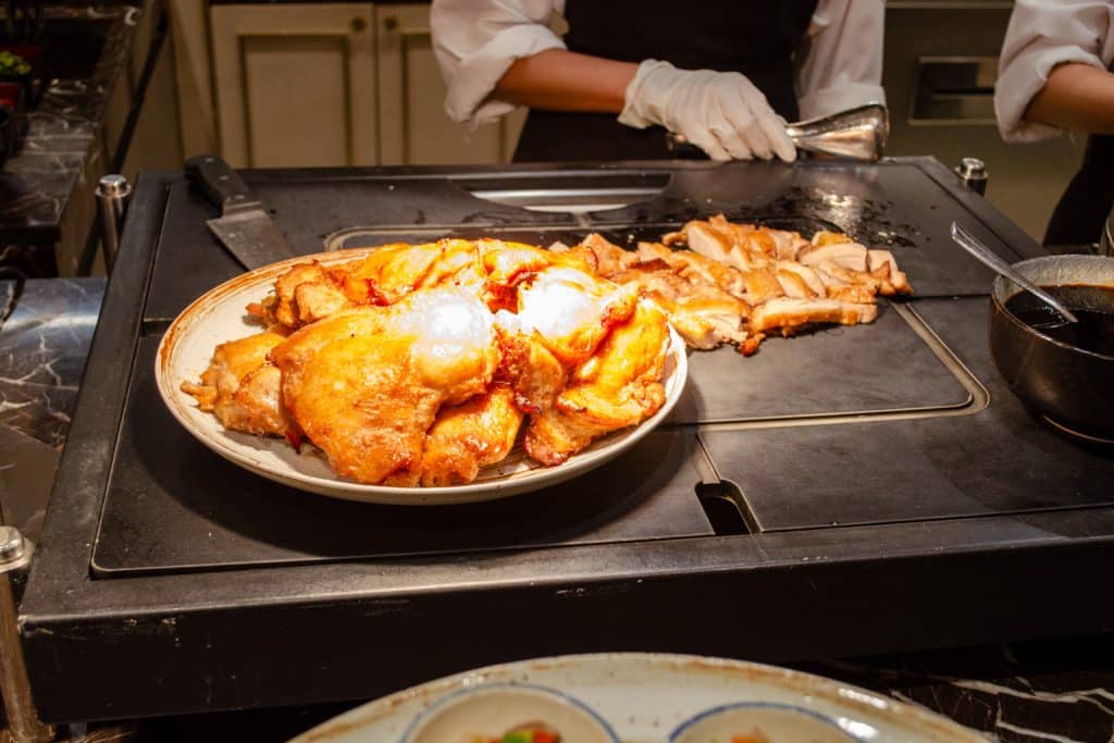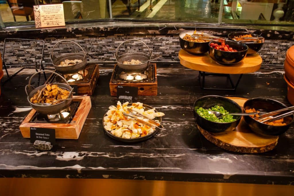 There are lots of different hot buffet items available, including fried rice, red bean congee, silken tofu, beans, bacon, dim sum, and even Hainanese chicken rice, to name a few. You’ll also find dishes from a number of world cuisines, including Indian, Thai, Western, Chinese, and Middle Eastern.