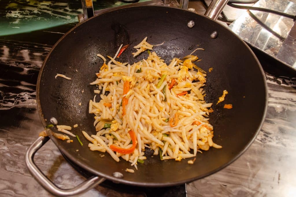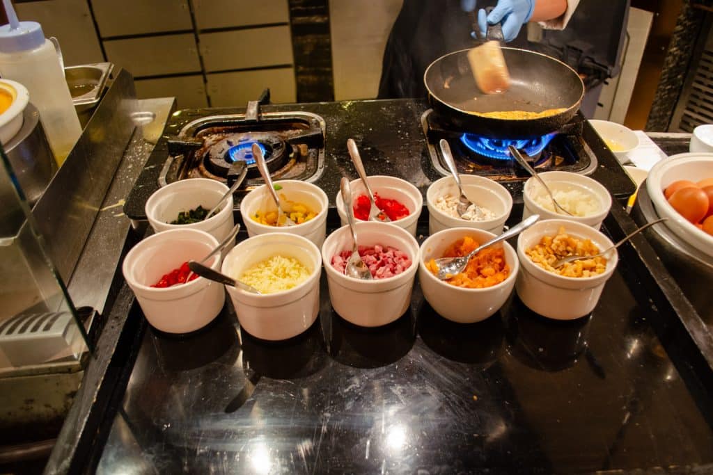 Along with self-serve buffet options, there are two live cooking stations, where you can customize both your omelets and noodle soup orders, and watch the chef prepare it right in front of you.