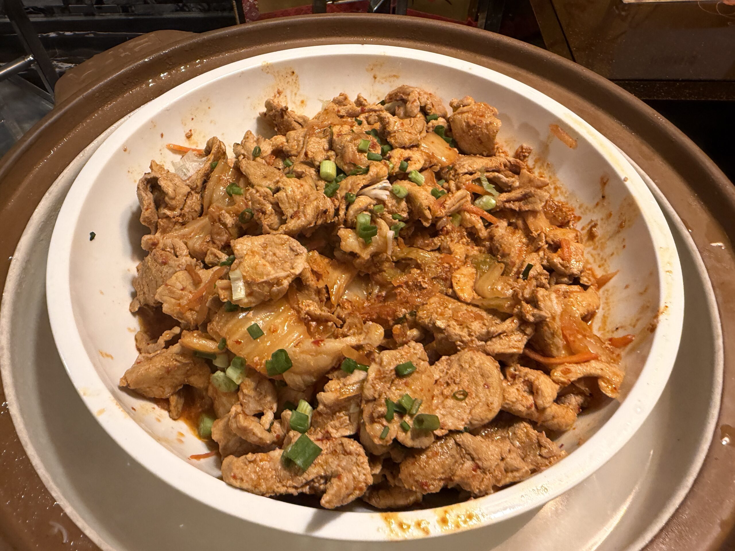 The Korean station had dishes like spicy stir-fried pork, sautéed greens, and japchae-style glass noodles.