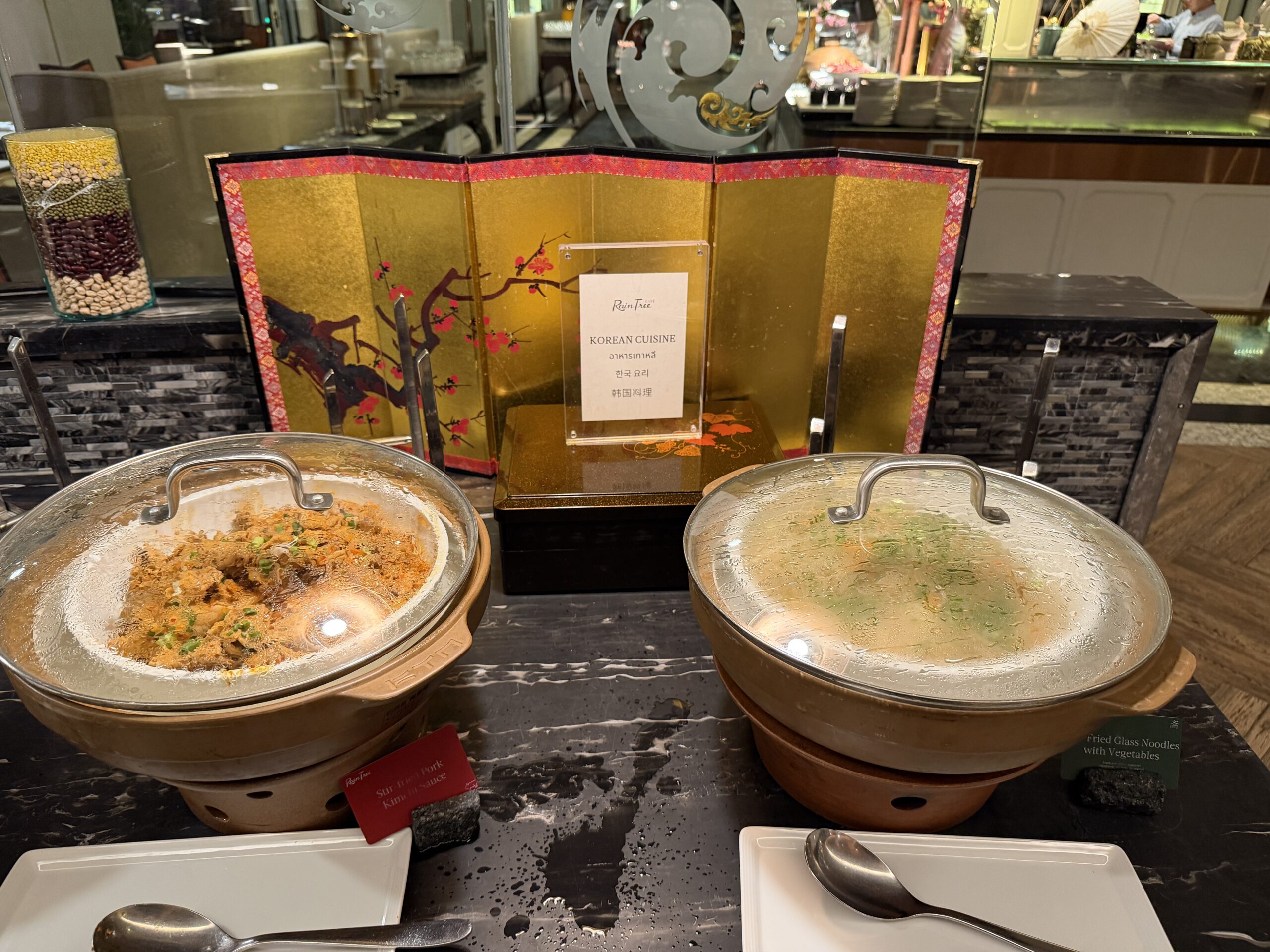 The Thai section is generous for a hotel breakfast. You’ll find white rice and organic riceberry, vegetable fried rice, red curry with beef, deep fried eggs tamarind sauce, pad thai, and simple boiled greens in broth.