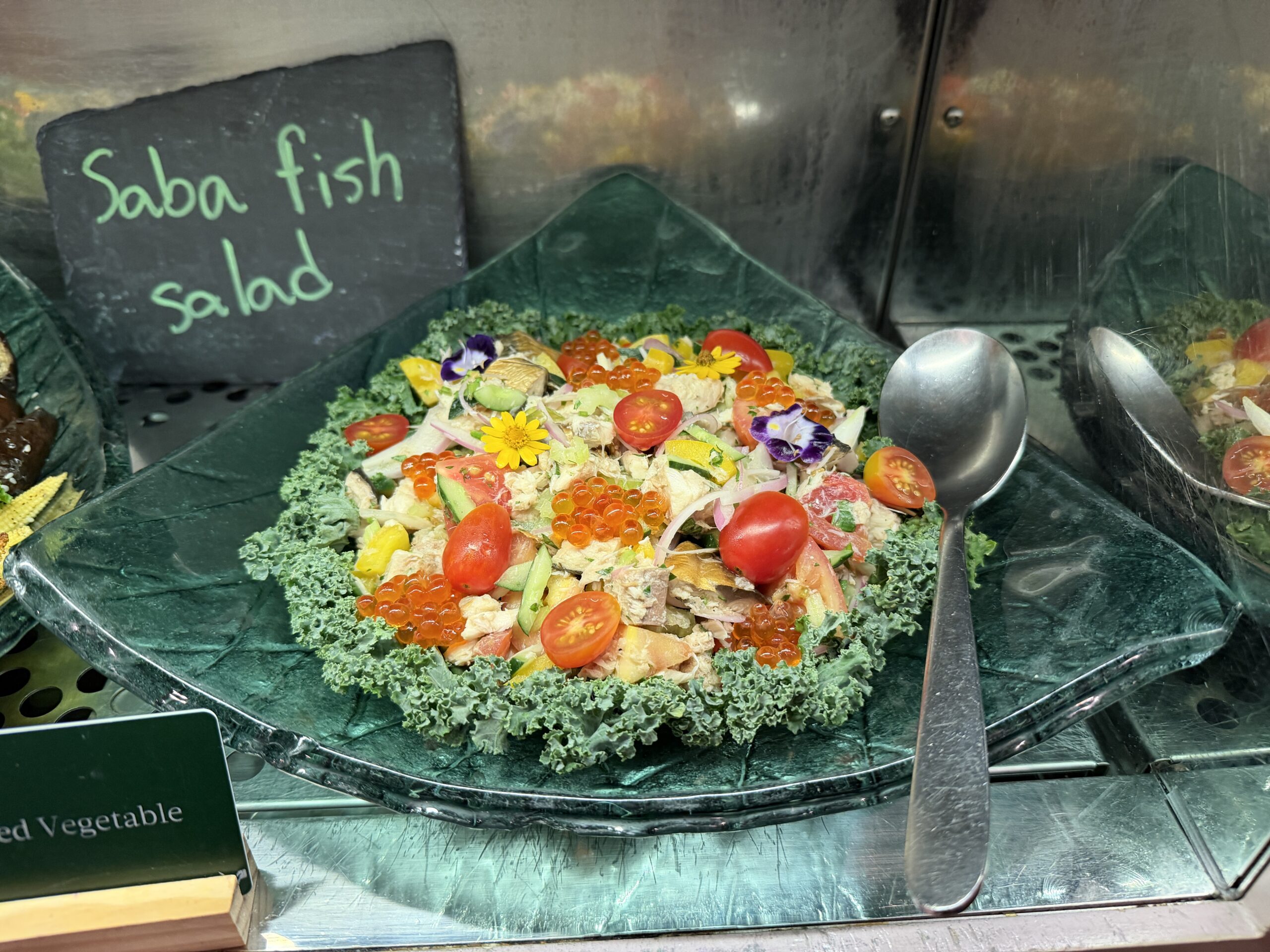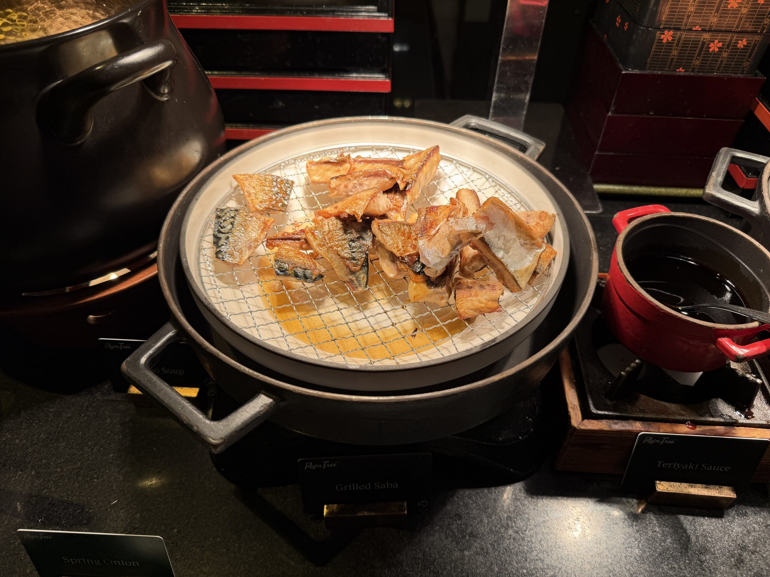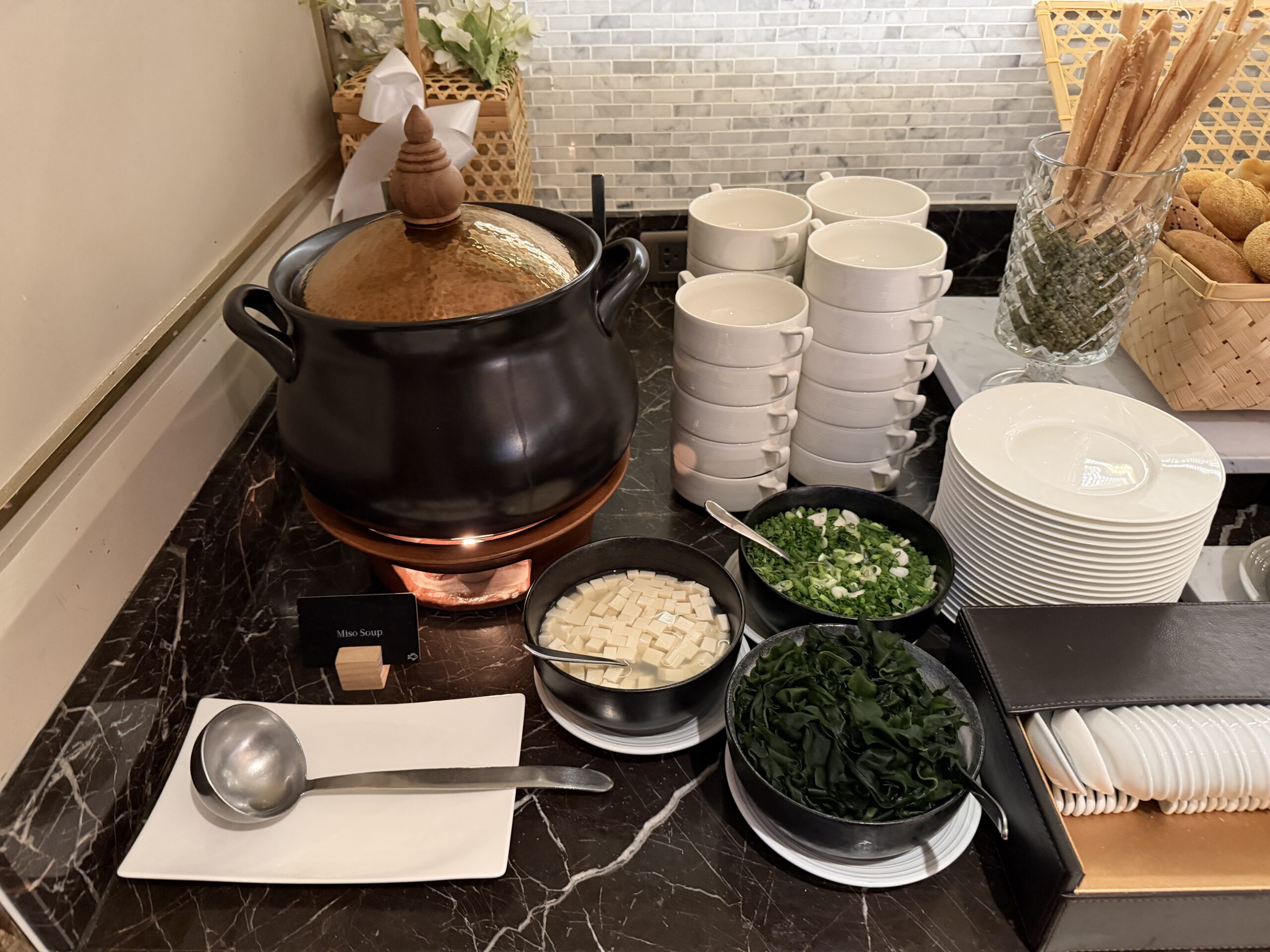 The Japanese corner offers miso soup with wakame, tofu, and spring onions, grilled salmon, steamed rice, and a few types of pickles. It’s a nice lighter option if you’re in the mood for something savoury but not too heavy.