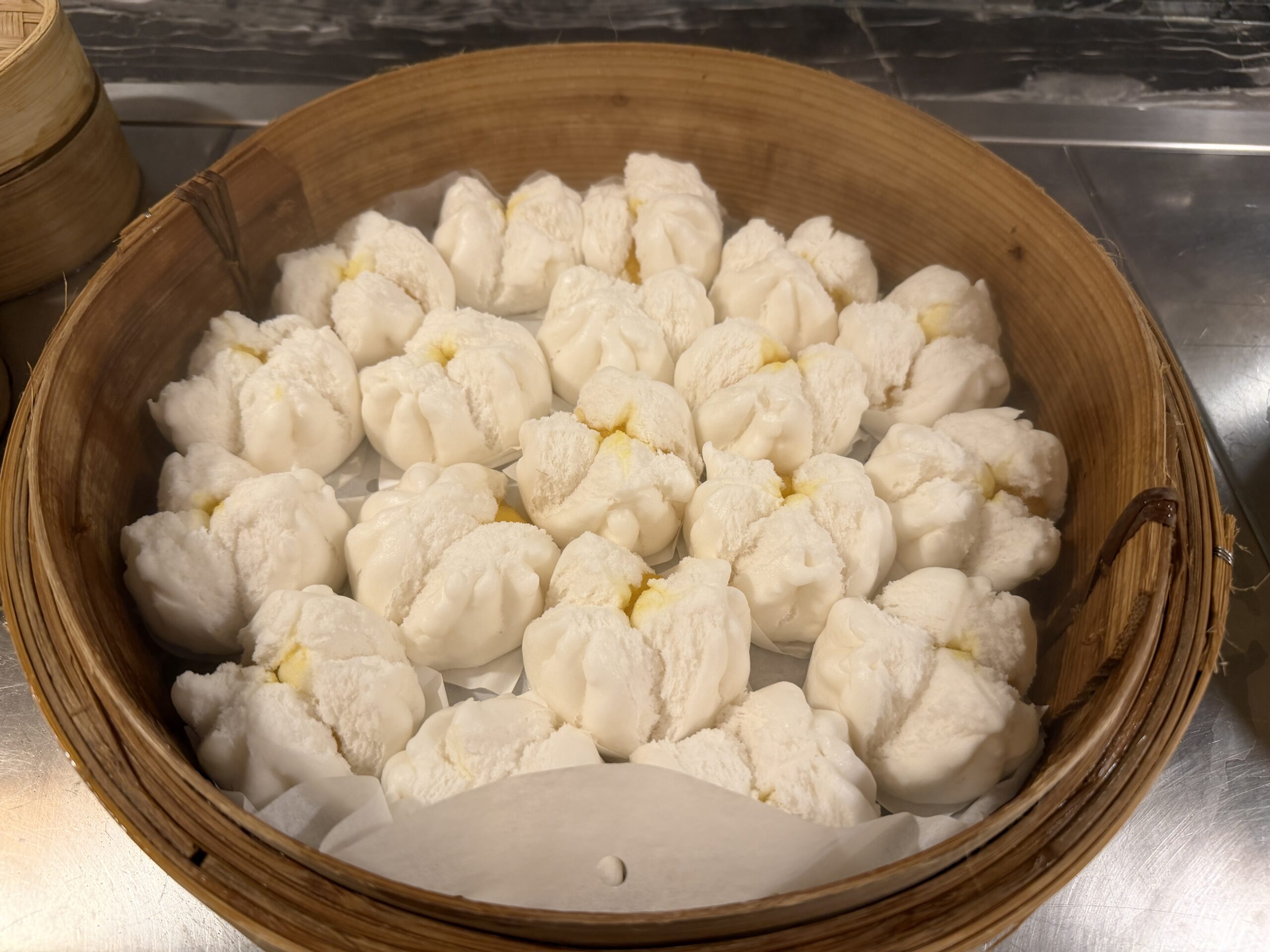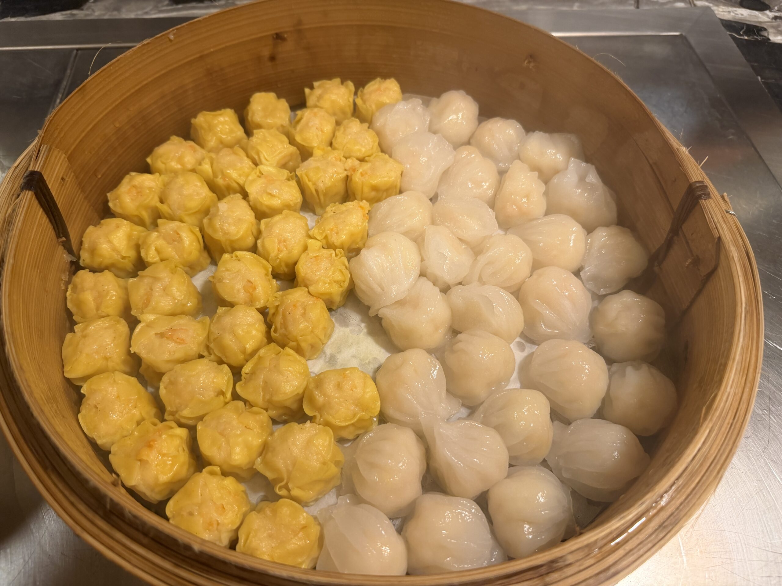 On the Chinese station, there was a full dim sum selection with baskets of siu mai, har gow, and steamed buns, plus Chinese dough fritters with sesame oil, soy sauce, or condensed milk.