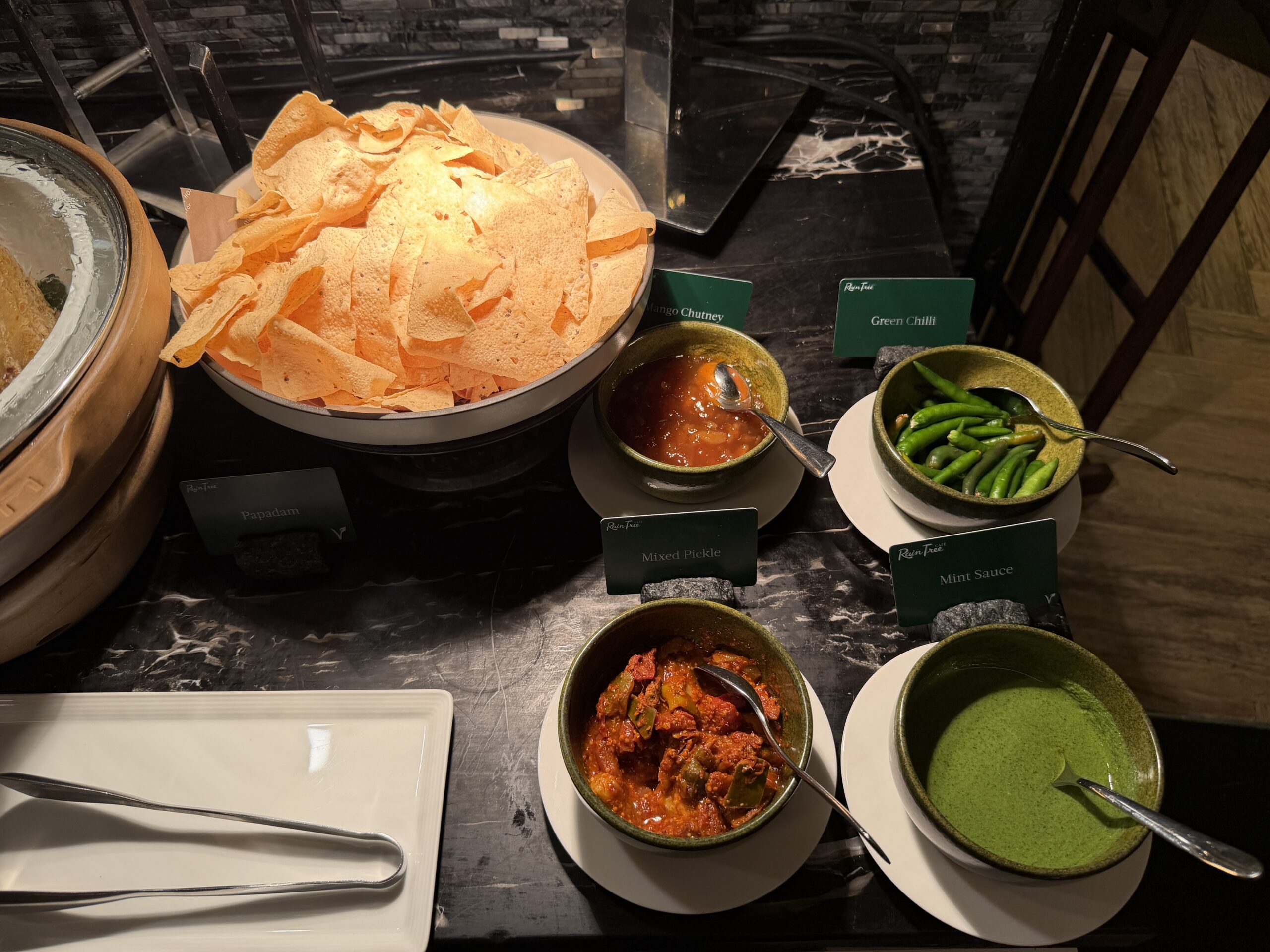 The Indian station is another highlight. During my stay, there was pav bhaji with soft bread rolls, upma, aloo paratha, and a side of papadum. Mango chutney, mixed pickles, green chillies, and mint sauce are set out so you can dial up the spice as you please.