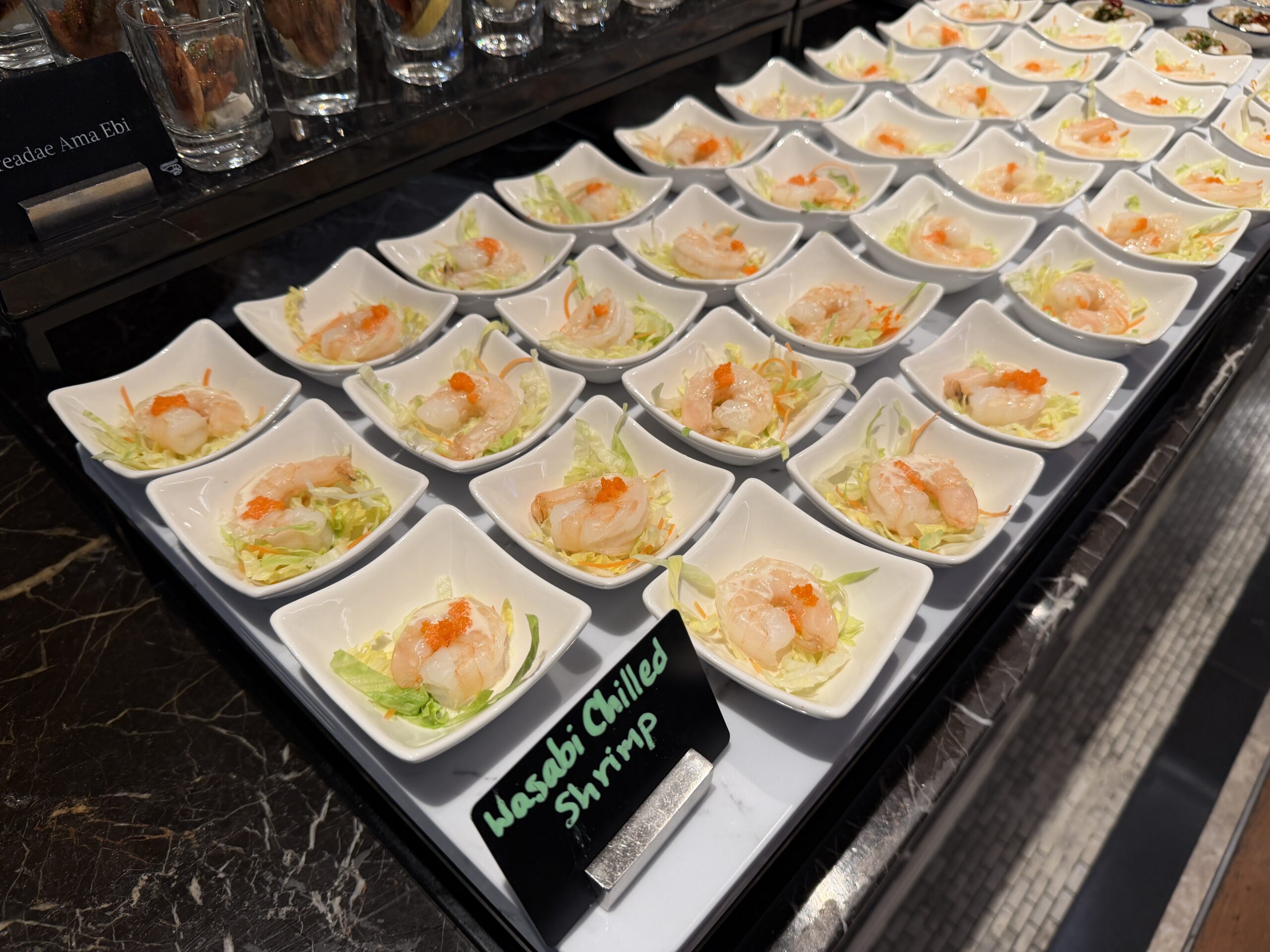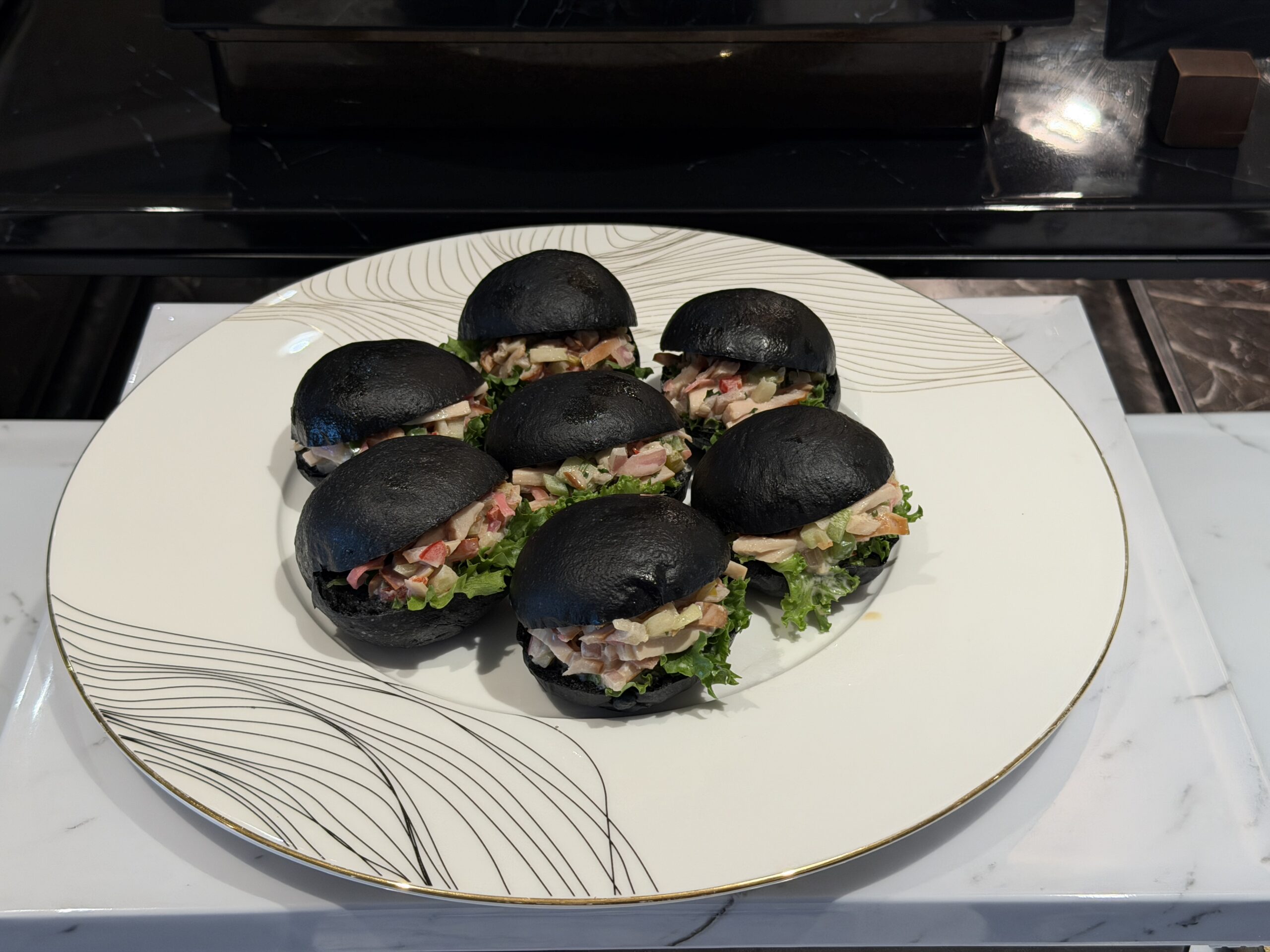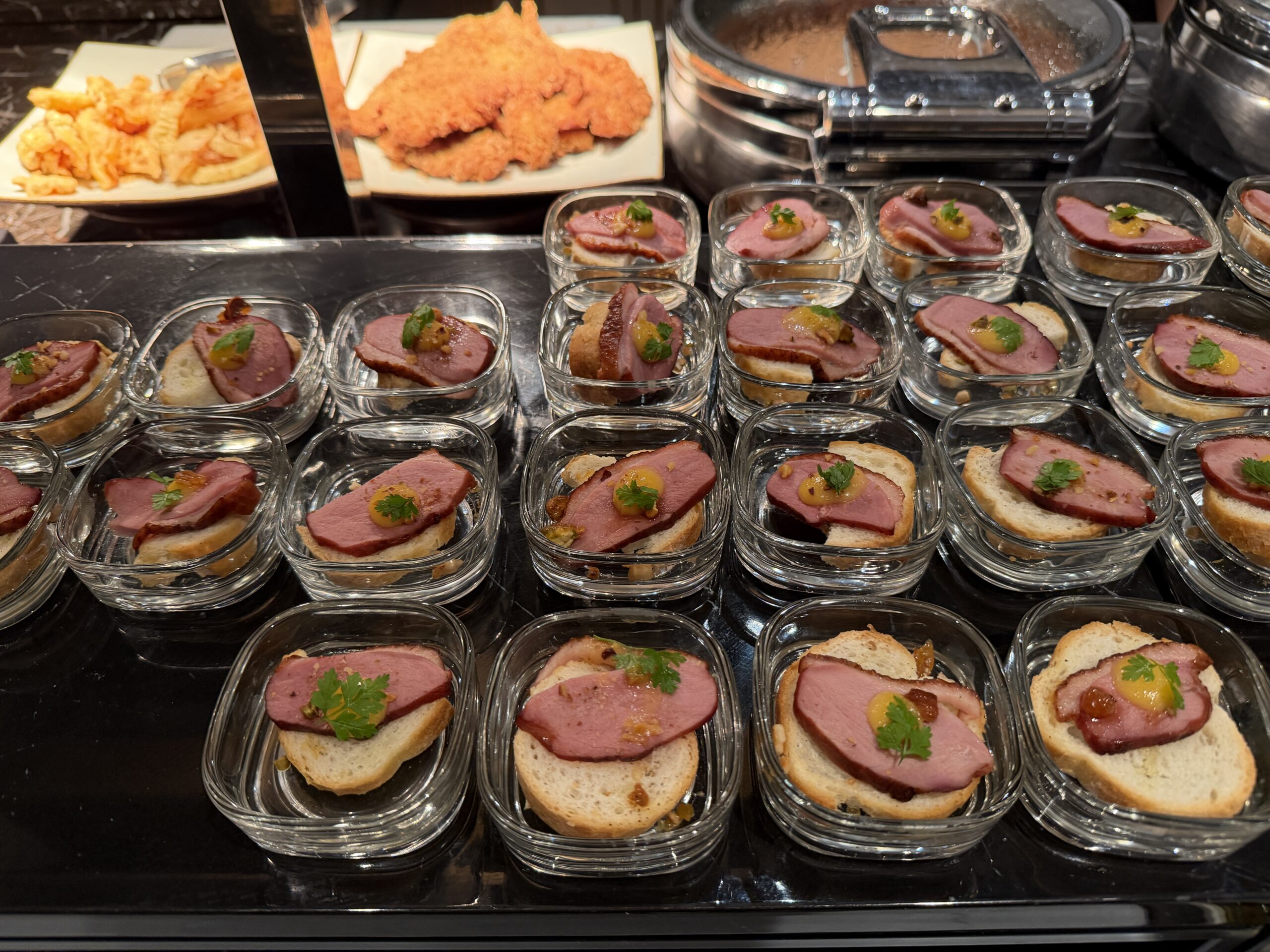 There’s a proper salad bar, grilled vegetables, quinoa salads, and plenty of cold items to start, alongside small sandwiches and shrimp sliders on charcoal buns. A cheese board, fresh fruit, and bite-sized desserts round things out if you’ve got a sweet tooth.