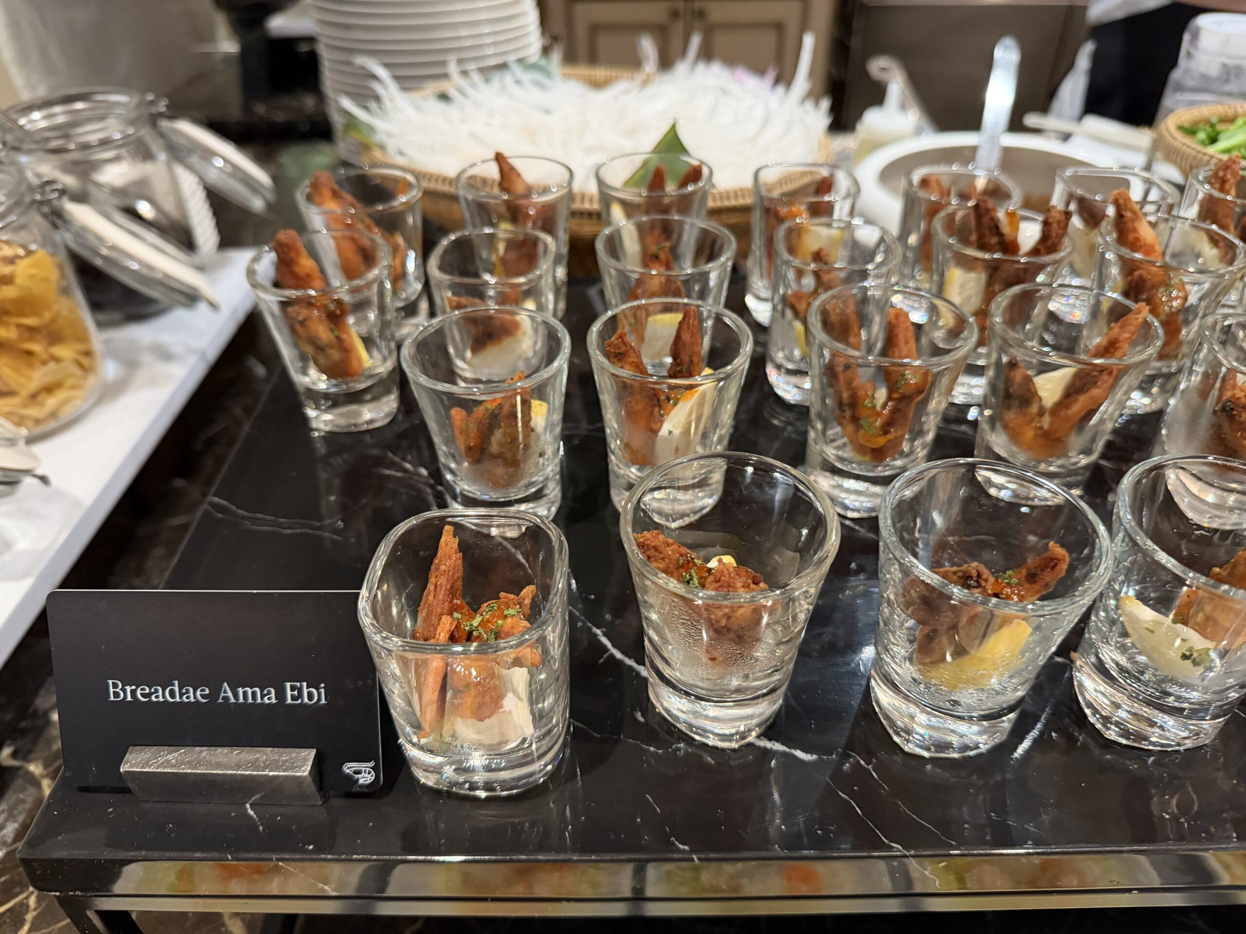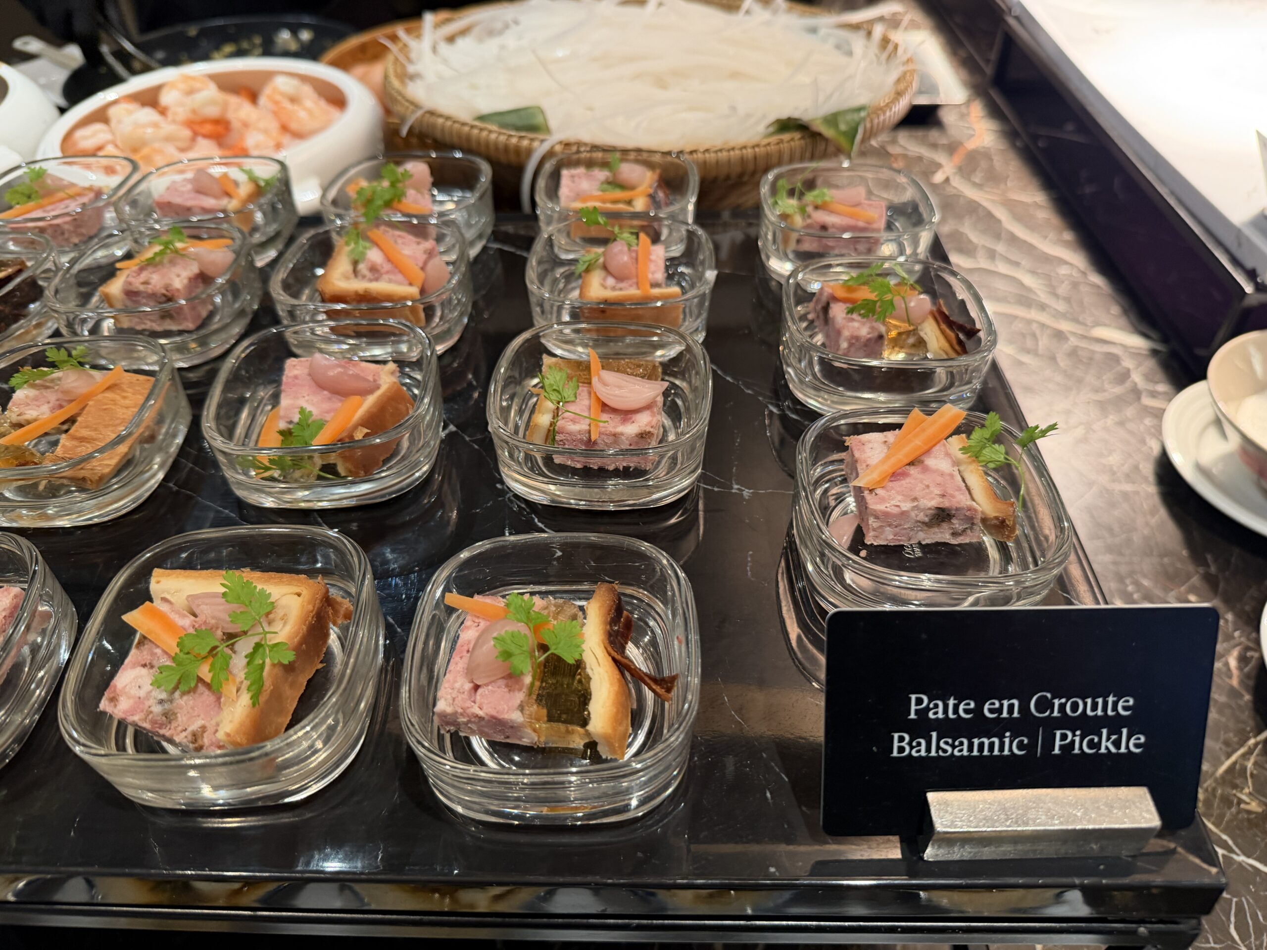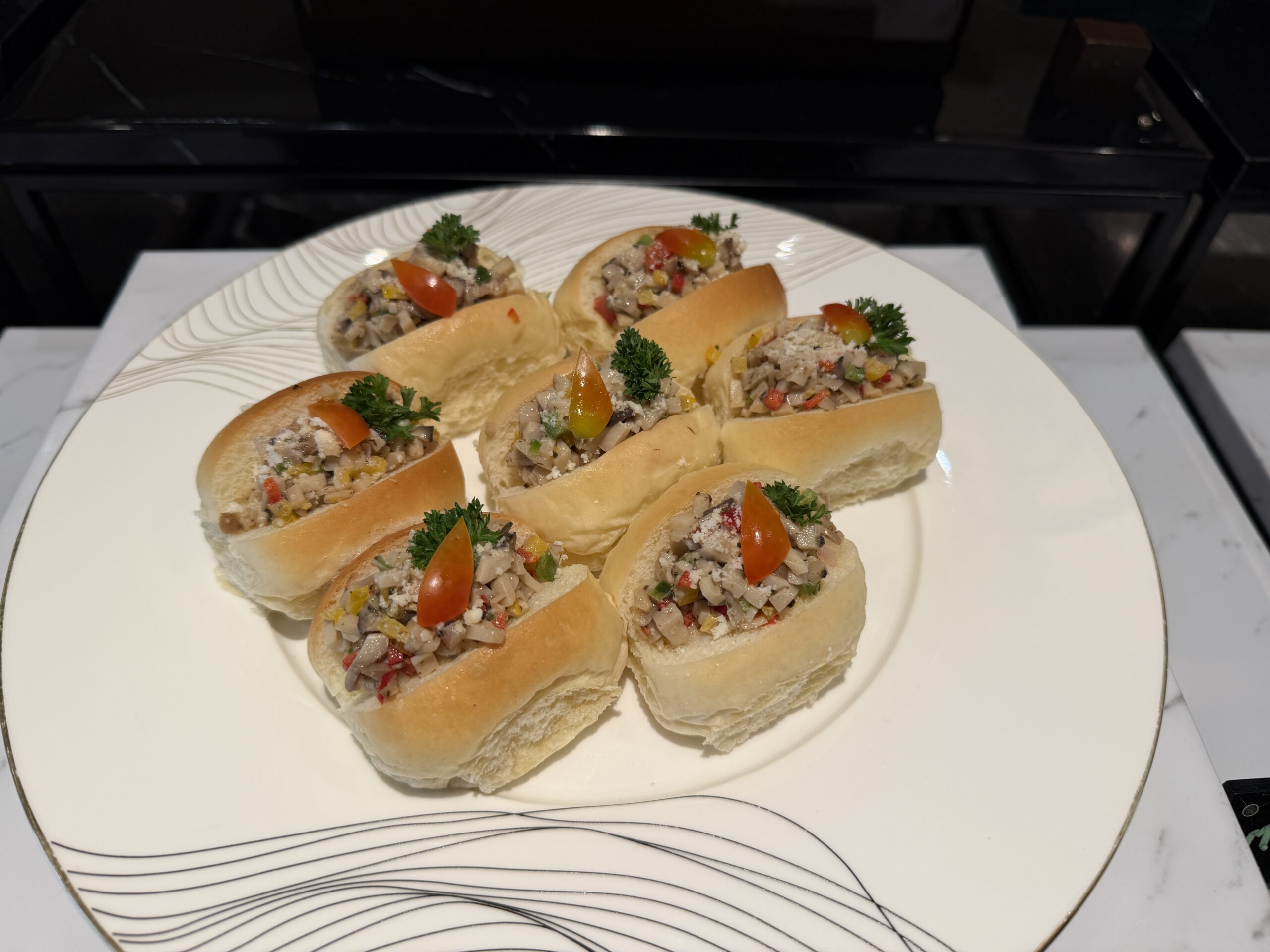 There’s a proper salad bar, grilled vegetables, quinoa salads, and plenty of cold items to start, alongside small sandwiches and shrimp sliders on charcoal buns. A cheese board, fresh fruit, and bite-sized desserts round things out if you’ve got a sweet tooth.