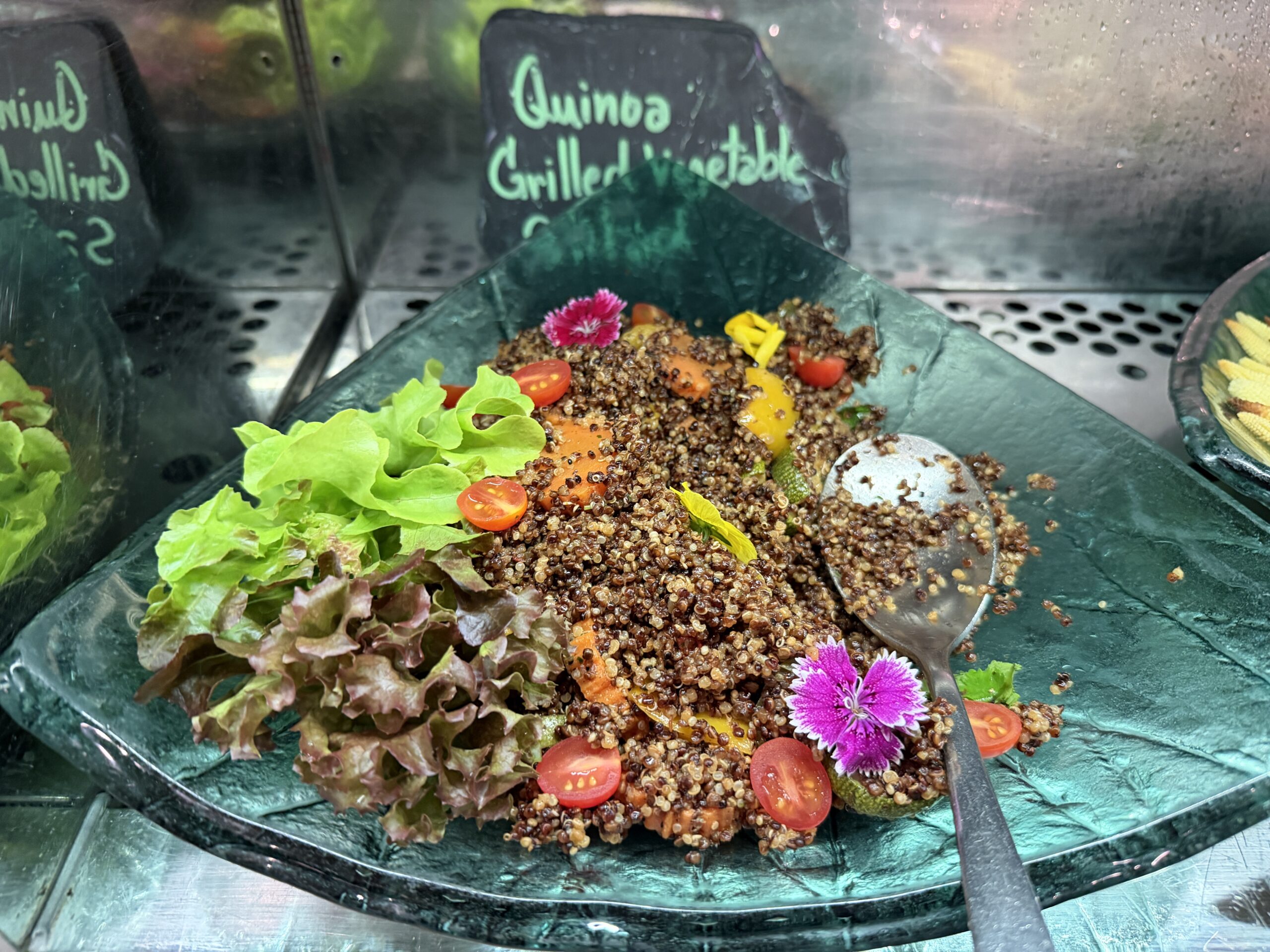 The “Organic Corner” has mixed greens with toppings like cherry tomatoes, pumpkin, carrots, and beans, plus several dressings. Nearby, quinoa salad and shrimp cocktail salad offer quick, ready-made options.